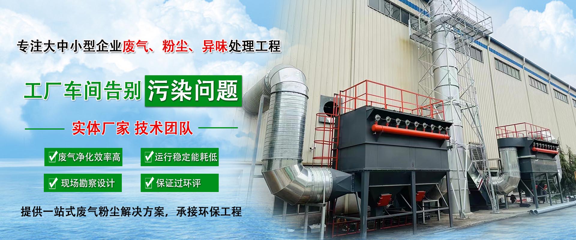 • 工廠廢氣治理涵蓋有機廢氣,噴涂廢氣,酸堿廢氣等各類工廠廢氣的治理。